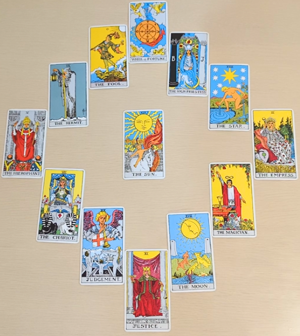 イヤーリーディングでは13枚のカードを使用し、下の写真のようなホロスコープスプレッドを展開します。