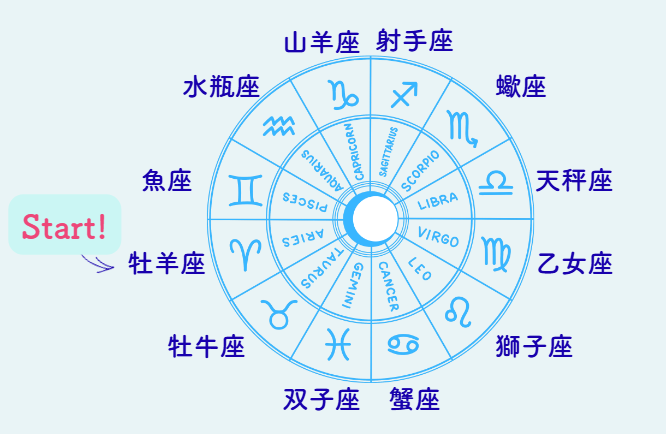 牡羊座がスタート地点となり、反時計周りで太陽は一年かけてぐるっと12星座を一周します。